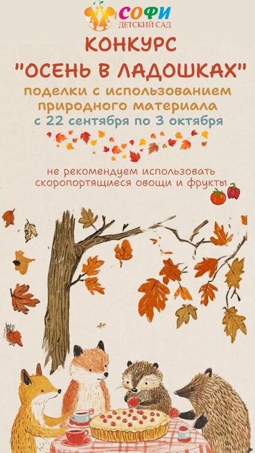 22.09.2025г. - Уважаемые родители, в детском саду проводится традиционный конкурс осенних поделок «Осень в ладошках».